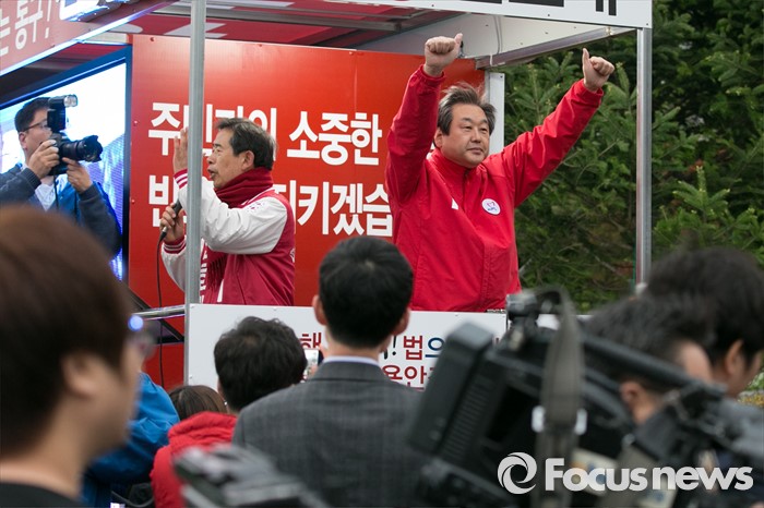 (울산=포커스뉴스) 김무성(오른쪽) 새누리당 대표가 11일 오전 울산시 동구 현대중공업 앞에서 안효대 울산 동구 후보 지원유세를 하고 있다.