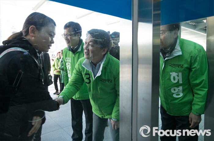 (인천=포커스뉴스) 안철수 국민의당 상임공동대표가 인천 서구갑 유길종 후보와 서구을 허영 후보와 함께 11일 아침 인천시 서구 검암역에서 출근인사를 하고 있다.