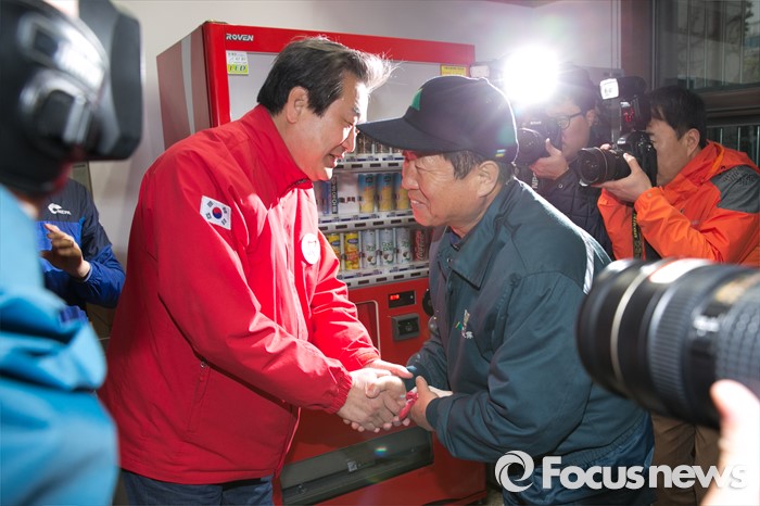 (울산=포커스뉴스) 김무성(왼쪽) 새누리당 대표가 11일 오전 울산시 동구 현대중공업 앞에서 안효대 울산 동구 후보 지원유세 중 근로자와 인사하고 있다.