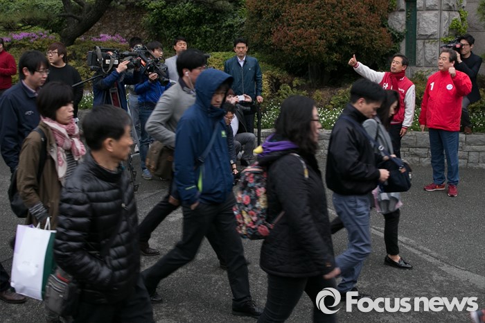(울산=포커스뉴스) 김무성(오른쪽) 새누리당 대표가 11일 오전 울산시 동구 현대중공업 앞에서 안효대 울산 동구 후보 지원유세를 하고 있다.