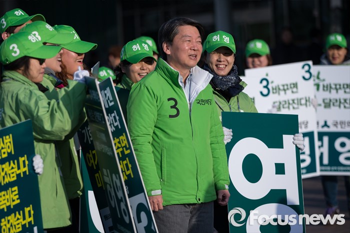 (인천=포커스뉴스) 안철수 국민의당 상임공동대표(가운데)가 인천 서구갑 유길종 후보와 서구을 허영 후보 캠프 선거운동원들과 함께 11일 아침 인천시 서구 검암역에서 출근인사를 하고 있다.