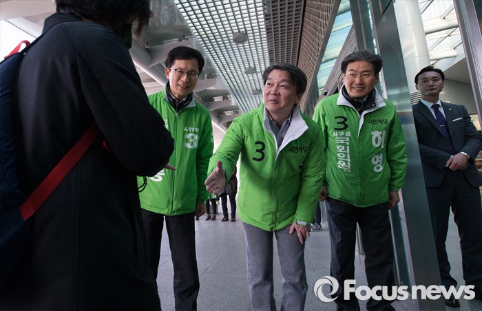 (인천=포커스뉴스) 안철수 국민의당 상임공동대표(가운데)가 인천 서구갑 유길종 후보와 서구을 허영 후보와 함께 11일 아침 인천시 서구 검암역에서 출근인사를 하고 있다.