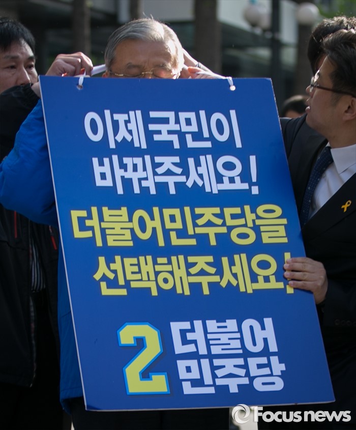 (서울=포커스뉴스) 20대 총선을 이틀 앞둔 11일 오전 서울 지하철 선릉역 인근 거리에서 투표참여 캠페인을 마친 김종인(가운데) 더불어민주당 비대위 대표 겸 선대위원장이 피켓을 벗고 있다.