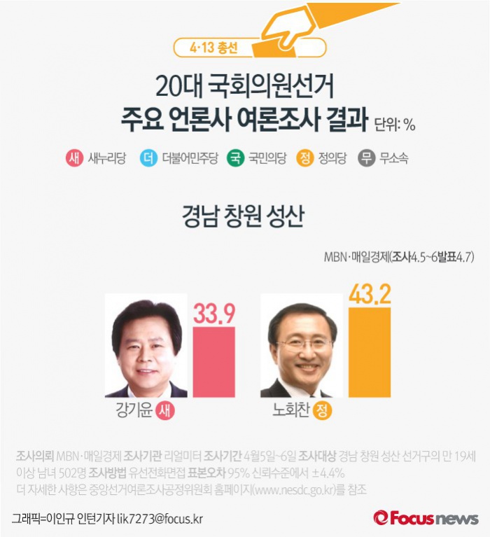 또 같은날 서울경제가 여론조사기관 리얼미터에 의뢰해 발표한 결과에서도 노 후보의 지지율이 39.0%에 달해, 36.5%를 기록한 강기윤 후보에 앞섰다.<사진출처=강기윤 새누리당 후보 페이스북>(서울=포커스뉴스) MBN, 매일경제가 여론조사기관 리얼미터에 의뢰해 7일 발표한 결과에 따르면 경남 창원 성산에서 새누리당 강기윤 후보의 지지율은 33.9%, 정의당 노회찬 후보의 지지율은 43.2%인 것으로 나타났다. 2016.04.08 이인규 인턴기자 (서울=포커스뉴스) 서울경제가 여론조사기관 리얼미터에 의뢰해 7일 발표한 결과에 따르면 경남 창원 성산에서 새누리당 강기윤 후보의 지지율은 36.5%, 정의당 노회찬 후보의 지지율은 39.0%인 것으로 나타났다. 2016.04.08 이인규 인턴기자