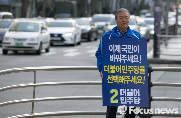 (서울=포커스뉴스) 20대 총선을 이틀 앞둔 11일 오전 서울 지하철 선릉역 인근 사거리에서 김종인 더불어민주당 비대위 대표 겸 선대위원장이 투표독려 캠페인을 하고 있다.