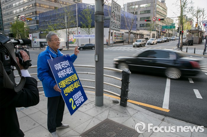 (서울=포커스뉴스) 20대 총선을 이틀 앞둔 11일 오전 서울 지하철 선릉역 인근 사거리에서 김종인 더불어민주당 비대위 대표 겸 선대위원장이 투표독려 캠페인을 하고 있다.