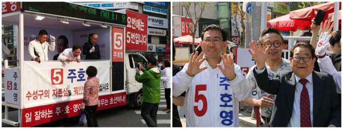 이어 "수성구는 언제나 주호영이다"면서 주민들에게 지지를 호소했다.개그맨 이상운·최형만과 함께 거리 유세에 나선 주호영 무소속 후보.(왼쪽) 주호영 후보 지원 유세에 나선 송해.(오른쪽) <출처= 주호영 후보 페이스북>
