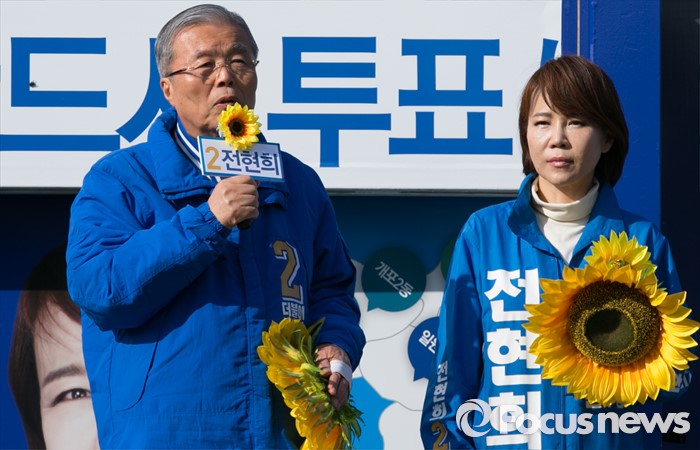 (서울=포커스뉴스) 20대 총선을 이틀 앞둔 11일 오전 서울 지하철 수서역 인근 거리에서 김종인(왼쪽) 더불어민주당 비대위 대표 겸 선대위원장과 전현희 강남을 후보가 지지를 호소하고 있다.