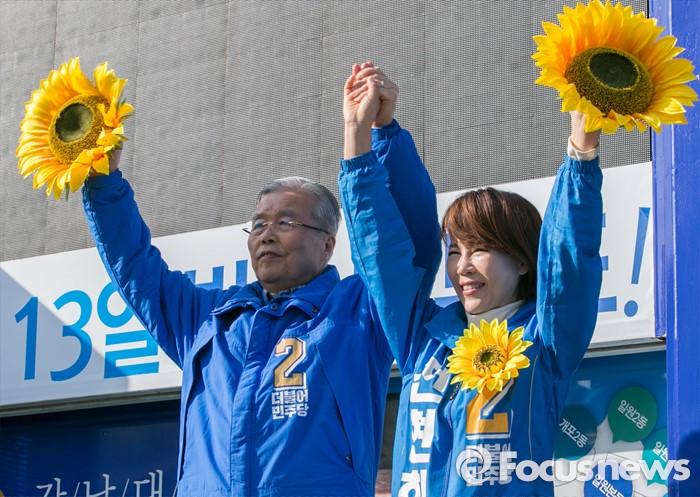 | △ 해바라기 들고 지지 호소하는 김종인-전현희 |