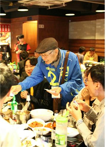 김창영 옹은 "전주시민들께서는, 부모 모시고 고향 전주를 굳건히 지킨 효자 막내아들 김성주를 버리지 않으실 거라 굳게 믿고 있다"며 "부모한테 효도하는 만큼 김성주가 전주시민들에게 효도할 수 있도록 부디 다시 한 번 기회를 달라"고 말했다.지난 9일 김성주 더불어민주당 후보(전북 전주병)의 아버지 김창영 옹이 대학가 주점을 방문하여 지지를 호소하고 있다. <사진출처=김성주 후보 선거사무소>