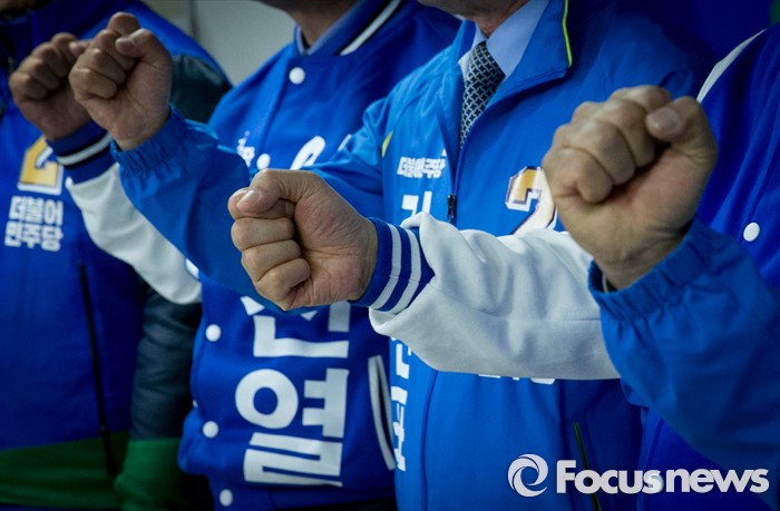 (수원=포커스뉴스) 20대 총선을 이틀 앞둔 11일 오전 수원 장안구 더불어민주당 경기도당 회의실에서 김종인 비대위 대표 겸 선대위원장이 수원 후보들과 대국민 성명 발표를 마친 뒤 구호를 외치고 있다. 왼쪽부터 이찬열 수원갑, 김진표 수원무 후보, 김 대표, 김영진 수원병 후보.