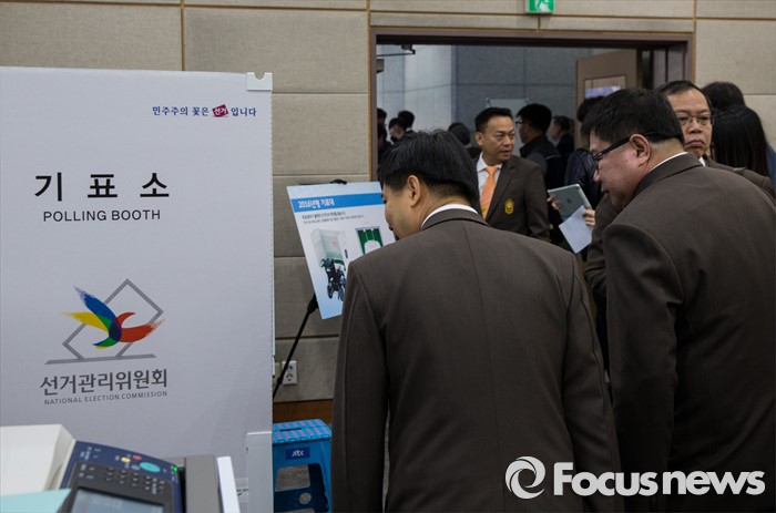 (과천=포커스뉴스) 4.13 총선을 이틀 앞둔 11일 오전 경기 과천 중앙선거관리위원회 내 제20대 국회의원선거상황실을 탐방온 태국선거위원회 관계자들이 기표소 모형을 둘러보고 있다.