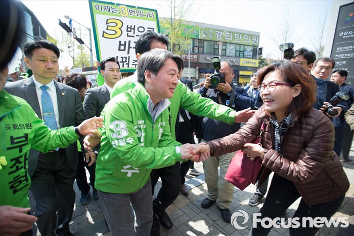 (안산=포커스뉴스) 안철수 국민의당 상임공동대표(가운데)가 11일 오전 안산시 단원구 고잔성당 사거리에서 부좌현 안산시 단원구을 후보 지원유세를 하고 있다.