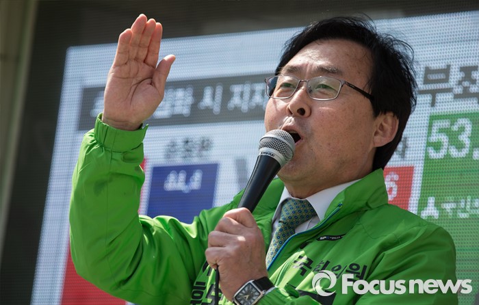 (안산=포커스뉴스) 부좌현 국민의당 단원구을 후보가 11일 오전 안산시 단원구 고잔성당 사거리에서 지지를 호소하고 있다.