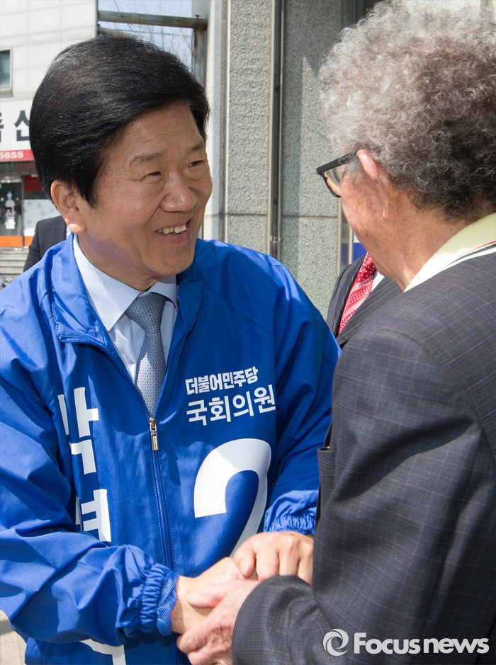 (대전=포커스뉴스) 20대 국회의원 선거를 이틀 남긴 11일 오전 대전 서구 흑석네거리에서 박병석 더불어민주당 후보가 시민들과 악수를 하고 지지를 호소하고 있다.