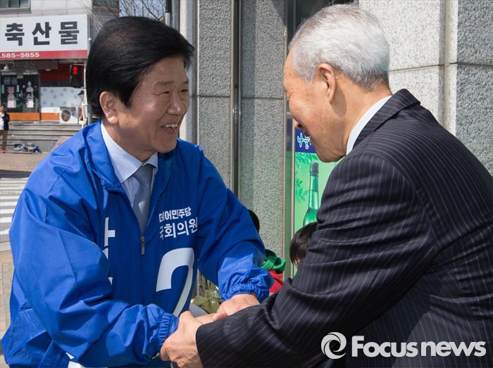 (대전=포커스뉴스) 20대 국회의원 선거를 이틀 남긴 11일 오전 대전 서구 흑석네거리에서 박병석 더불어민주당 후보가 시민들과 악수를 하고 지지를 호소하고 있다.