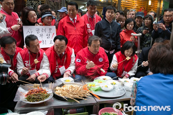 (부산=포커스뉴스) 제20대 총선에서 부산 중구영도에 출마한 김무성(앞줄 오른쪽 두번째) 새누리당 대표가 11일 오후 부산 중구 국제시장 먹자골목 좌판 음식점에 앉아, 부인 최양옥(앞줄 오른쪽) 씨와 음식을 먹고 있다.