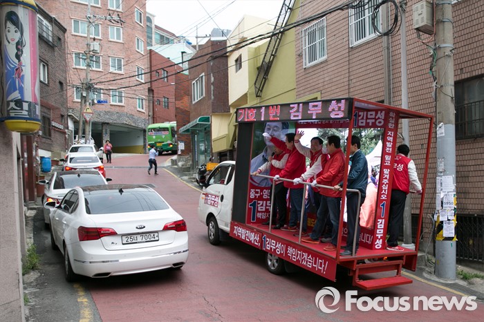 (부산=포커스뉴스) 제20대 총선에서 부산 중구영도에 출마한 김무성 새누리당 대표가 11일 오후 부산 중구 보수동 책방골목에서 유세차량을 타고 선거운동을 하고 있다.