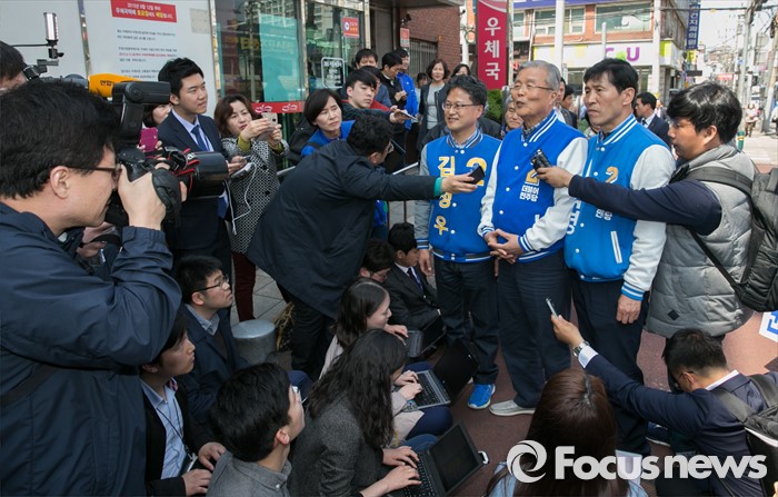 (군포=포커스뉴스) 20대 총선을 이틀 앞둔 11일 오후 경기도 군포 당동우체국 사거리에서 열린 더불어민주당 군포지역 합동유세에 참석한 김종인(가운데) 비대위 대표 겸 선대위원장이 김정우(왼쪽) 군포갑, 이학영 군포을 후보와 함께 취재진 질문에 답하고 있다.
