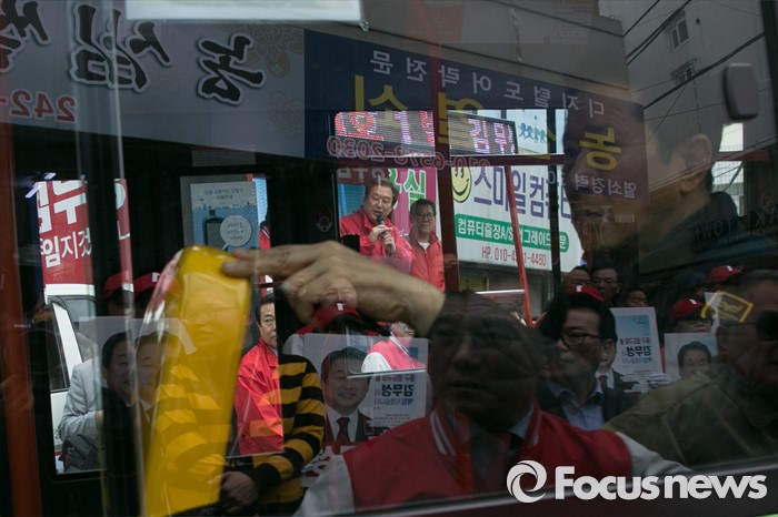 (부산=포커스뉴스) 제20대 총선에서 부산 중구영도에 출마한 김무성 새누리당 대표가 11일 오후 부산 중구 보수동 책방골목 앞에서 유세를 하고 있다.