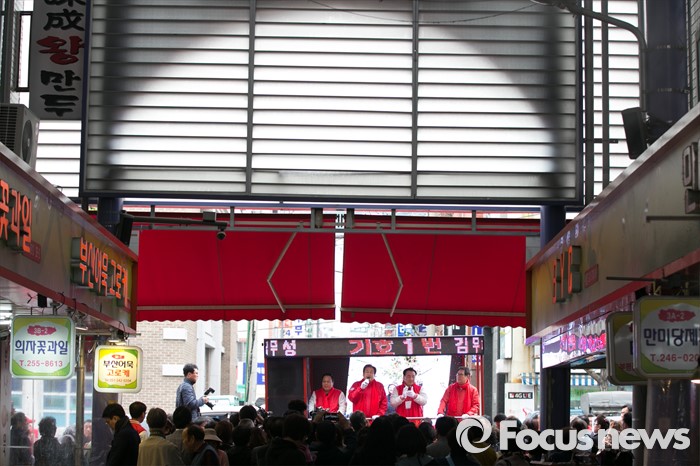 (부산=포커스뉴스) 제20대 총선에서 부산 중구영도에 출마한 김무성 새누리당 대표가 11일 오후 부산 중구 부평동 깡통시장 앞에서 유세를 하고 있다.