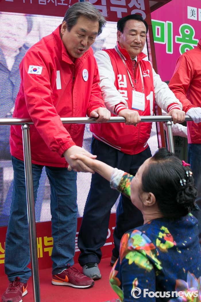(부산=포커스뉴스) 제20대 총선에서 부산 중구영도에 출마한 김무성 새누리당 대표가 11일 오후 부산 중구 보수동 책방골목에서 유세를 마친 뒤, 시민들과 악수하고 있다.