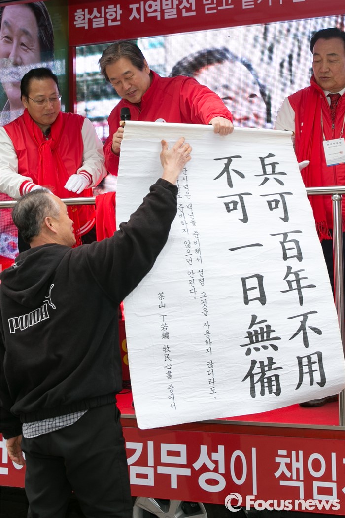 (부산=포커스뉴스) 제20대 총선에서 부산 중구영도에 출마한 김무성 새누리당 대표가 11일 오후 부산 중구 국제시장 앞에서 유세 중, 지지자로부터 족자를 받고 있다.