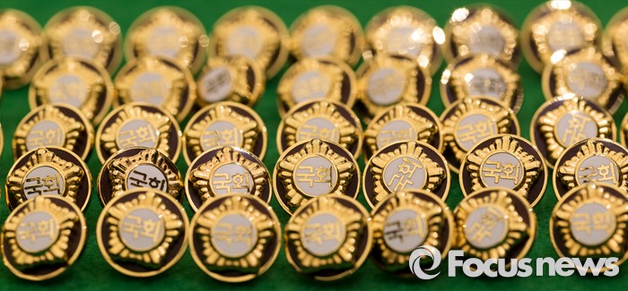 (서울=포커스뉴스) 4.13총선을 이틀 앞둔 11일 오후 서울 여의도 국회에서 20대 국회의원 당선자들이 착용할 배지가 공개되고 있다.