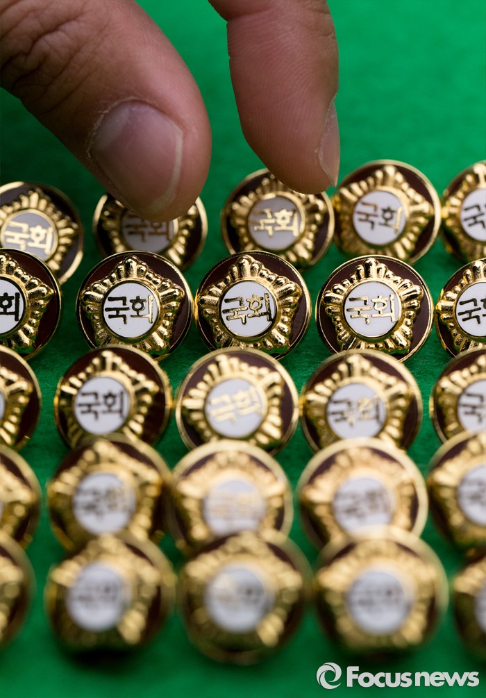 (서울=포커스뉴스) 4.13총선을 이틀 앞둔 11일 오후 서울 여의도 국회에서 20대 국회의원 당선자들이 착용할 배지가 공개되고 있다.