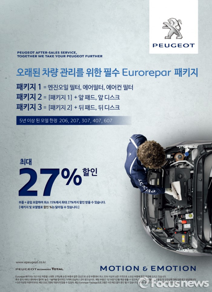 (서울=포커스뉴스) 푸조의 공식 수입원 한불모터스는 최초 등록한지 5년 이상 된 차량들을 대상으로 한 소모성 부품 제공 서비스 '유로레파 패키지'를 출시한다고 11일 밝혔다.