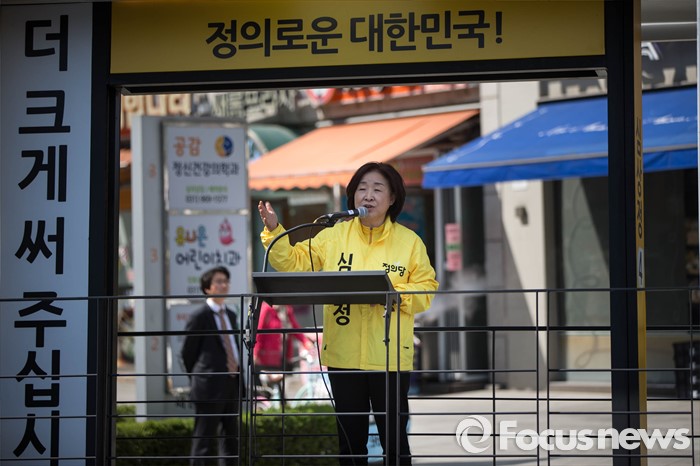 (고양=포커스뉴스) 11일 오후 경기도 고양시 덕양구 세이브존 쇼핑몰 앞에서 심상정 정의당 후보가 시민들을 향해 한 표를 호소하고 있다.