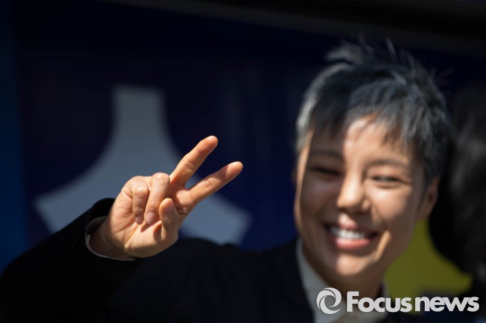 (서울=포커스뉴스) 20대 총선을 이틀 앞둔 11일 오후 서울 마포구 망원시장 일대에서 가수 이은미가 손혜원 더불어민주당 마포구을 후보의 지지를 호소하고 있다.