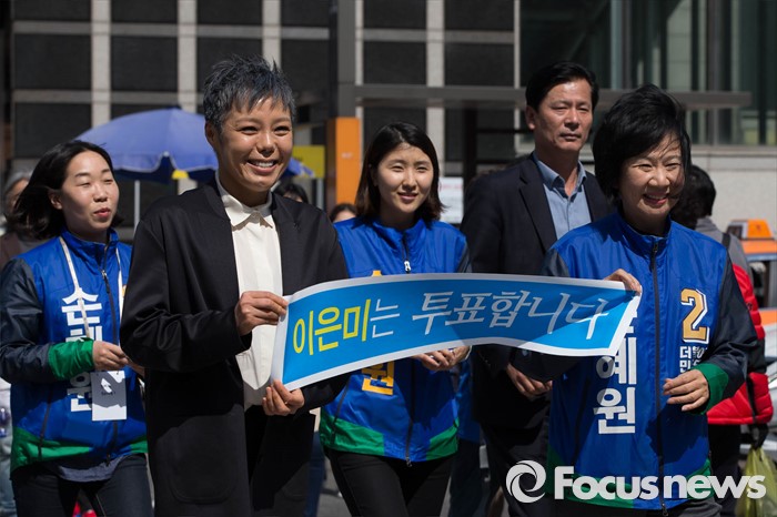(서울=포커스뉴스) 20대 총선을 이틀 앞둔 11일 오후 서울 마포구 망원시장 일대에서 손혜원 더불어민주당 마포구을 후보가 가수 이은미와 함께 선거유세를 하고 있다.
