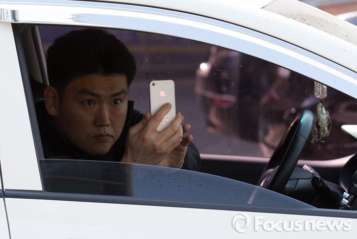 (청주=포커스뉴스) 11일 오후 충북 청주시 사창사거리에서 시민이 신호등에 정차중 핸드폰으로안철수 국민의당 대표를 촬영하고 있다.