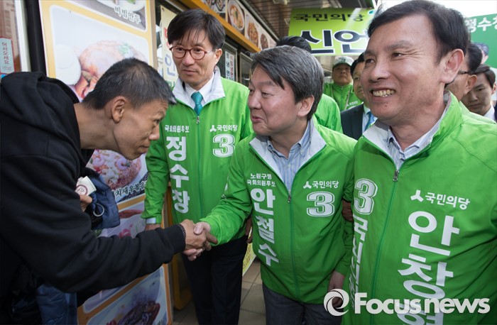 (청주=포커스뉴스) 안철수 국민의당 대표가 11일 오후 충북 청주시 사창사거리에서 20대 국회의원 충북도에 출마한 국민의당 후보의 지지를 호소하며 시민들과 악수를 하고 있다.
