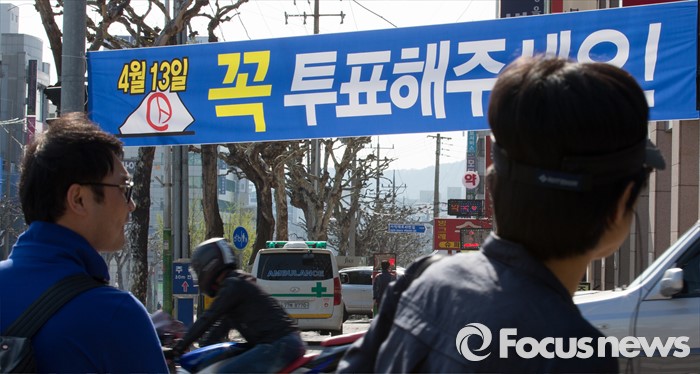 (청주=포커스뉴스) 20대 국회의원 선거를 이틀 앞둔 11일 오후 충북 청주시 복대동에 선거독려 현수막이 걸려져 있다.