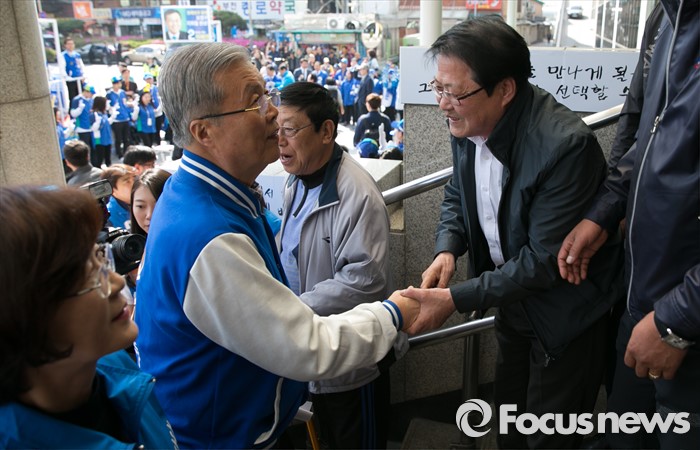 (부천=포커스뉴스) 20대 총선을 이틀 앞둔 11일 오후 경기도 부천역 남부광장에서 열린 더불어민주당 부천지역 합동유세에 참석한 김종인 비대위 대표 겸 선대위원장이 시민 및 지지자들과 인사하고 있다.