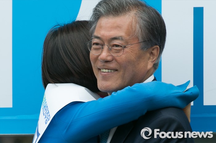 (부산=포커스뉴스) 문재인(오른쪽) 전 더불어민주당 대표가 11일 오후 부산시 사상구 가야대로 주례럭키아파트 앞에서 배재정 더불어민주당 사상 후보 지원유세에 참석해, 배 후보와 포옹하고 있다.