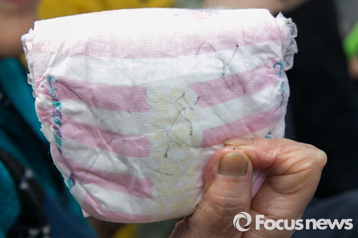 (부산=포커스뉴스) 11일 오후 부산시 사상구 가야대로 주례럭키아파트 앞에서 한 시민이 문재인 전 더불어민주당 대표로부터 받은 기저귀 사인을 보이고 있다.