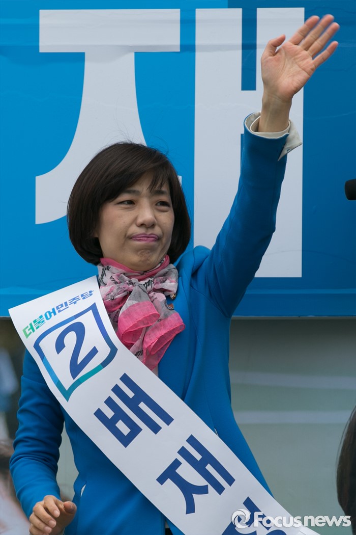 (부산=포커스뉴스) 11일 오후 부산시 사상구 가야대로 주례럭키아파트 앞에서 배재정 더불어민주당 사상 후보가 유세 중, 손을 흔들고 있다.