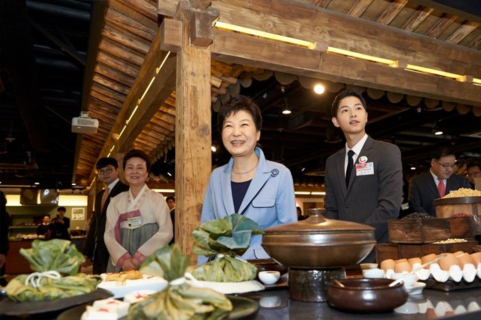 (서울=포커스뉴스) 박근혜 대통령은 11일 오전 서울 중구 한국관광공사 서울센터에서 열린 K-스타일 허브(K-Style Hub) 한식문화관 개소식에서 배우 송중기 및 윤숙자 한식재단 이사장 등과 함께 전시관들을 둘러보고 있다. <사진출처=청와대>