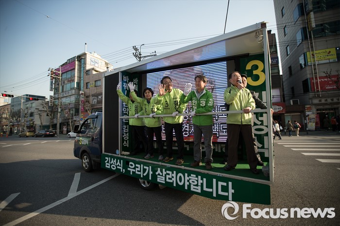 | △ 선거 차량 타고 선거운동하는 안철수와 김성식 |