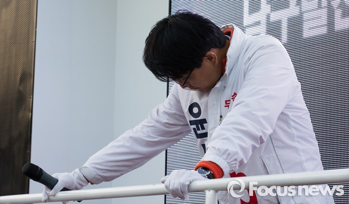 (인천=포커스뉴스) 20대 총선을 이틀 앞둔 11일 오후 인천 남구 제물포역 앞에서 윤상현 무소속 남구을 후보가 유권자에게 지지호소 후 고개를 숙이고 있다.