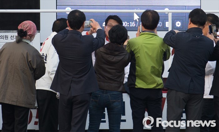 (인천=포커스뉴스) 20대 총선을 이틀 앞둔 11일 오후 인천 남구 제물포역 앞에서 열린 윤상현 무소속 남구을 후보 유세현장을 찾은 지지자들이 윤 후보를 촬영하고 있다.