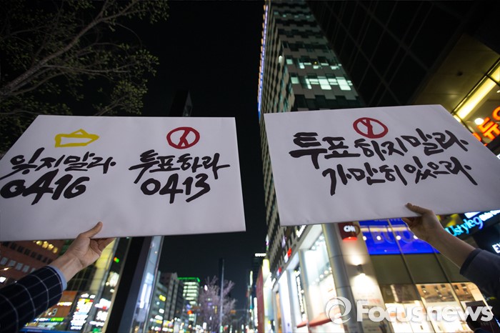 (서울=포커스뉴스) 11일 오후 서울 서초구 강남역 일대에서 세월호 진상규명 서명 시민지킴이들이 투표참여 캠페인으로 피켓팅을 하고 있다.
