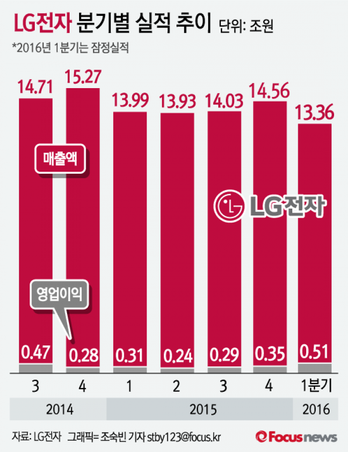 (서울=포커스뉴스) LG전자는 11일 2016년 1분기 기준 영업이익이 전년대비 65.5% 늘어난 5052억원으로 잠정 집계됐다고 공시했다. 매출은 13조3621억원으로 전년대비 4.5% 줄었다.