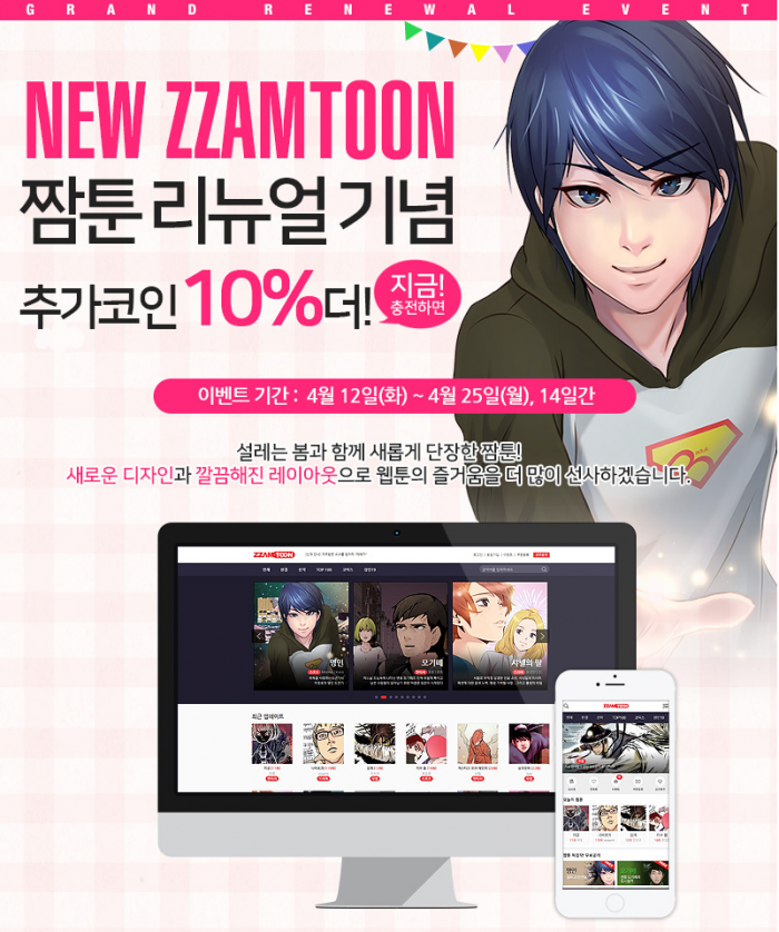 짬툰은 리뉴얼에 앞서 보다 폭넓은 이용자층을 형성하기 위해 지난달부터 '검계', '로스타임', '샤넬의 딸', '하이스쿨 히어로즈' 등 다양한 장르의 신작을 연속해서 론칭해왔다. 이 밖에도 지급 받은 보너스 코인을 통해 짬툰에서 독점으로 연재 중인 '총수 비기닝', '고교정점' 등의 작품을 포함해 약 180회차 이상의 유료 웹툰을 열람할 수 있다.