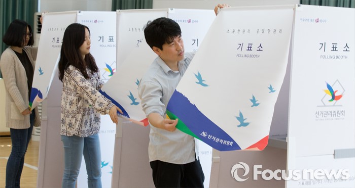 (세종=포커스뉴스) 20대 국회의원 선거를 하루 앞둔 12일 오전 세종시 조치원읍 세종시민체육관에 마련된 투표소에서 관계자들이 투표소 준비를 하고 있다.