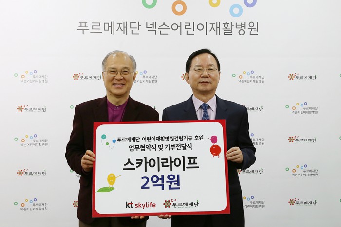 KT스카이라이프는 11일 서울 마포구 상암동 ‘푸르메재단 넥슨어린이재활병원’ 대회의실에서 푸르메재단과 업무 협약을 체결하고 지속적인 병원 후원에 나선다고 밝혔다. 이 병원은 국내에 처음으로 문을 여는 어린이재활병원으로 하루 500명, 연간 15만 명에 달하는 장애어린이와 지역 주민이 이용할 수 있다.