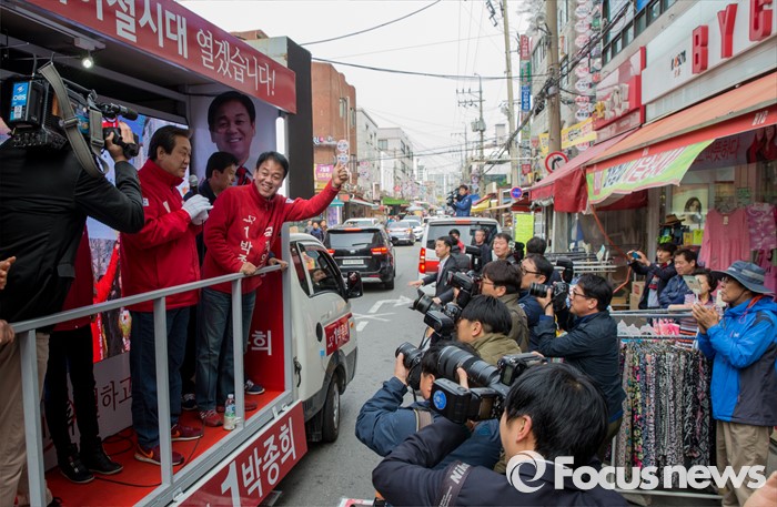 (수원=포커스뉴스) 4.13 총선을 하루 앞둔 12일 오전 경기 수원 정자시장에서 박종희 새누리당 수원시갑 후보 지원유세에 나선 김무성 대표가 유권자들에게 박 후보의 지지를 호소하고 있다.